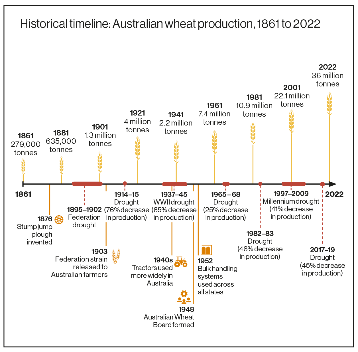 Today, Australia is one of the global top exporters of wheat. It was dethroned last year from first place by Russia. But ABS stats show farmers turned that first five-tonne crop in 1789 into a 36 million tonne bonanza in 2022.