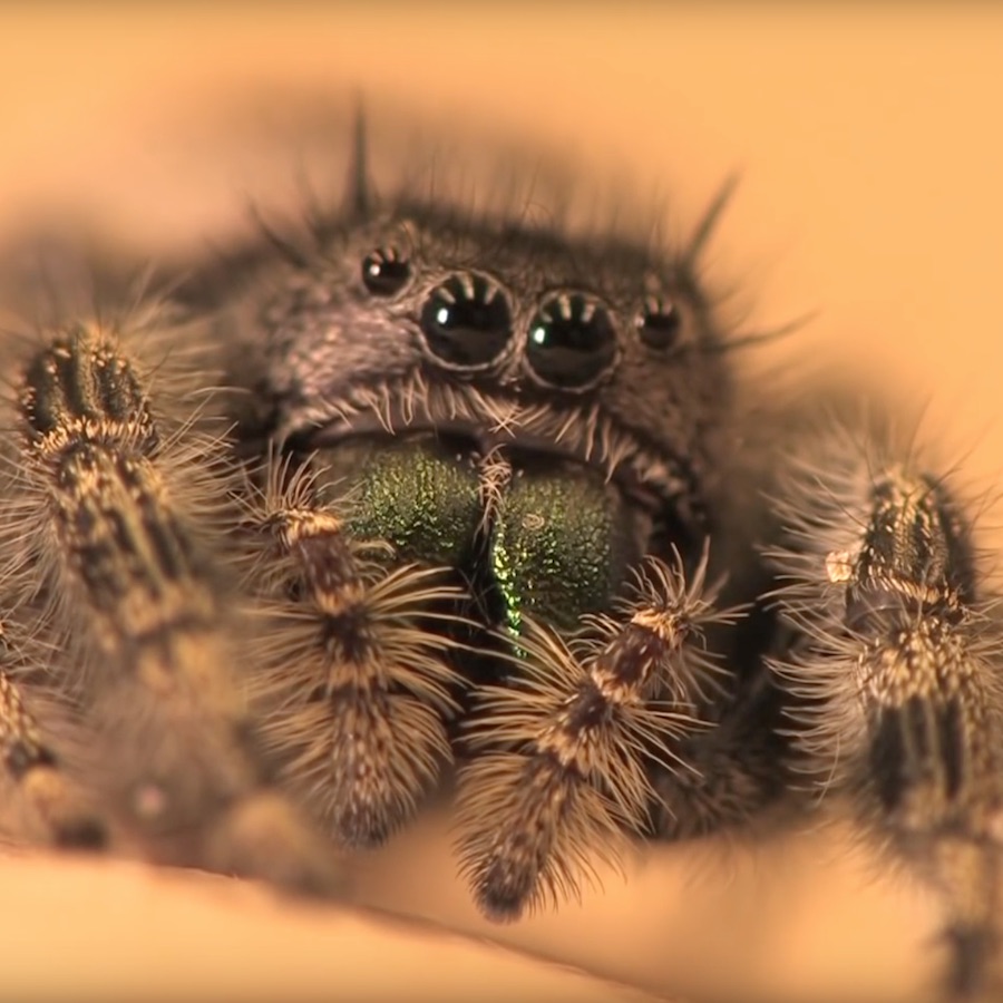 Looking at the eyes of a jumping spider, you can see why biologists thought that they had little to no need for excellent hearing.