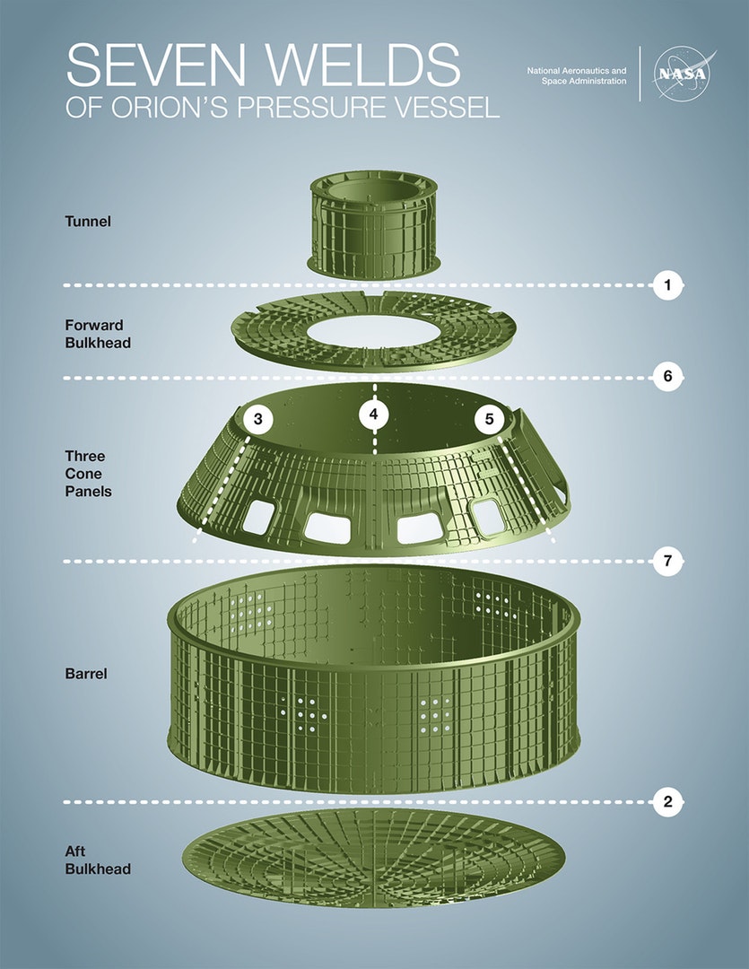 The primary structure of Orion’s crew module is made of seven large aluminum pieces that must be welded together in detailed fashion. The first weld connects the tunnel to the forward bulkhead, which is at the top of the spacecraft and houses many of Orion’s critical systems, such as the parachutes that deploy during reentry. Orion’s tunnel, with a docking hatch, will allow crews to move between the crew module and other spacecraft.