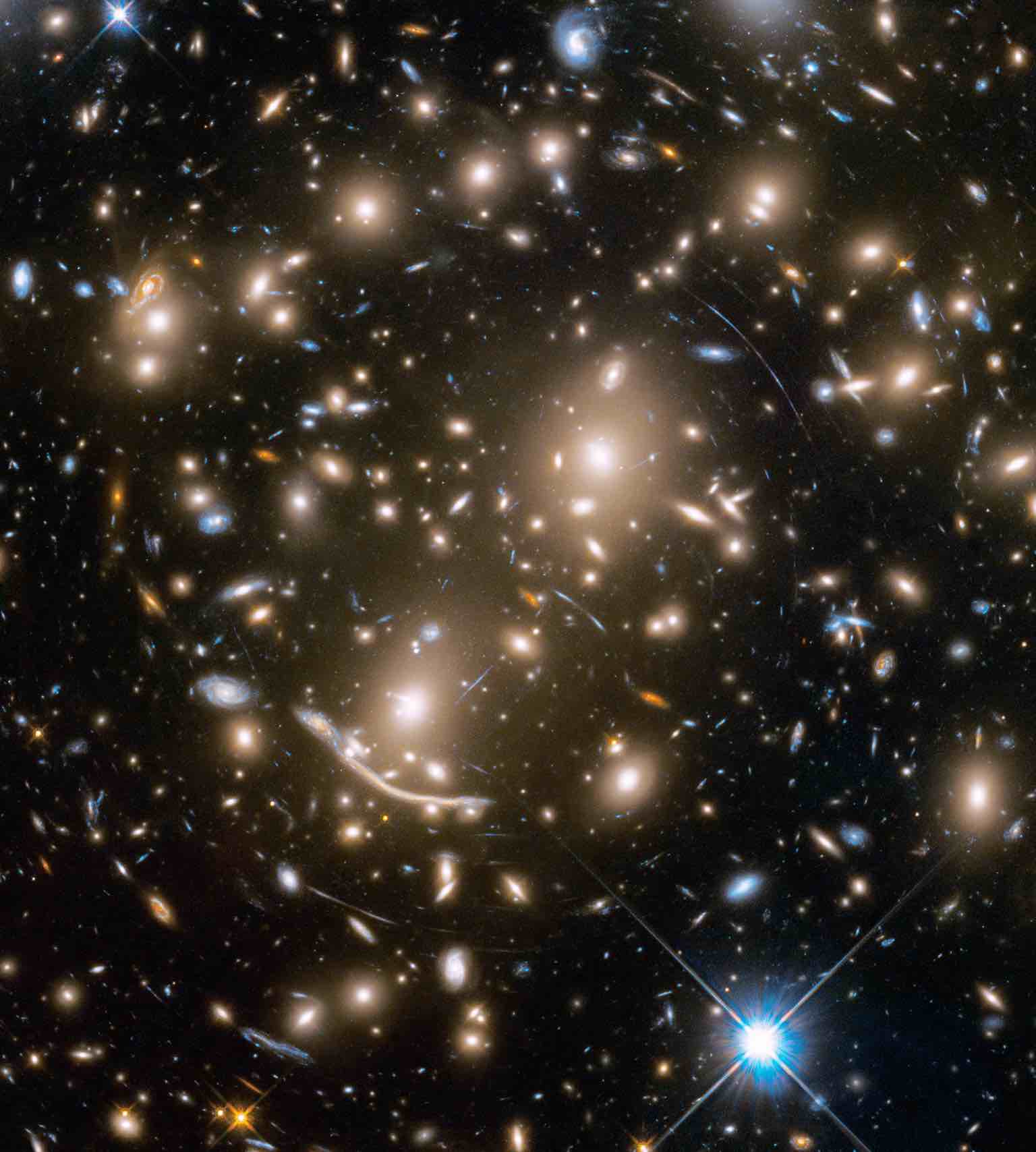 Abell 370, a galaxy cluster located nearly 4 billion light-years away from Earth. The Dragon Arc is in the lower left of centre. These arcs are caused by gravitational lensing: Light from even more distant galaxies is bent around the massive gravity of Abell 370. Credit: NASA
